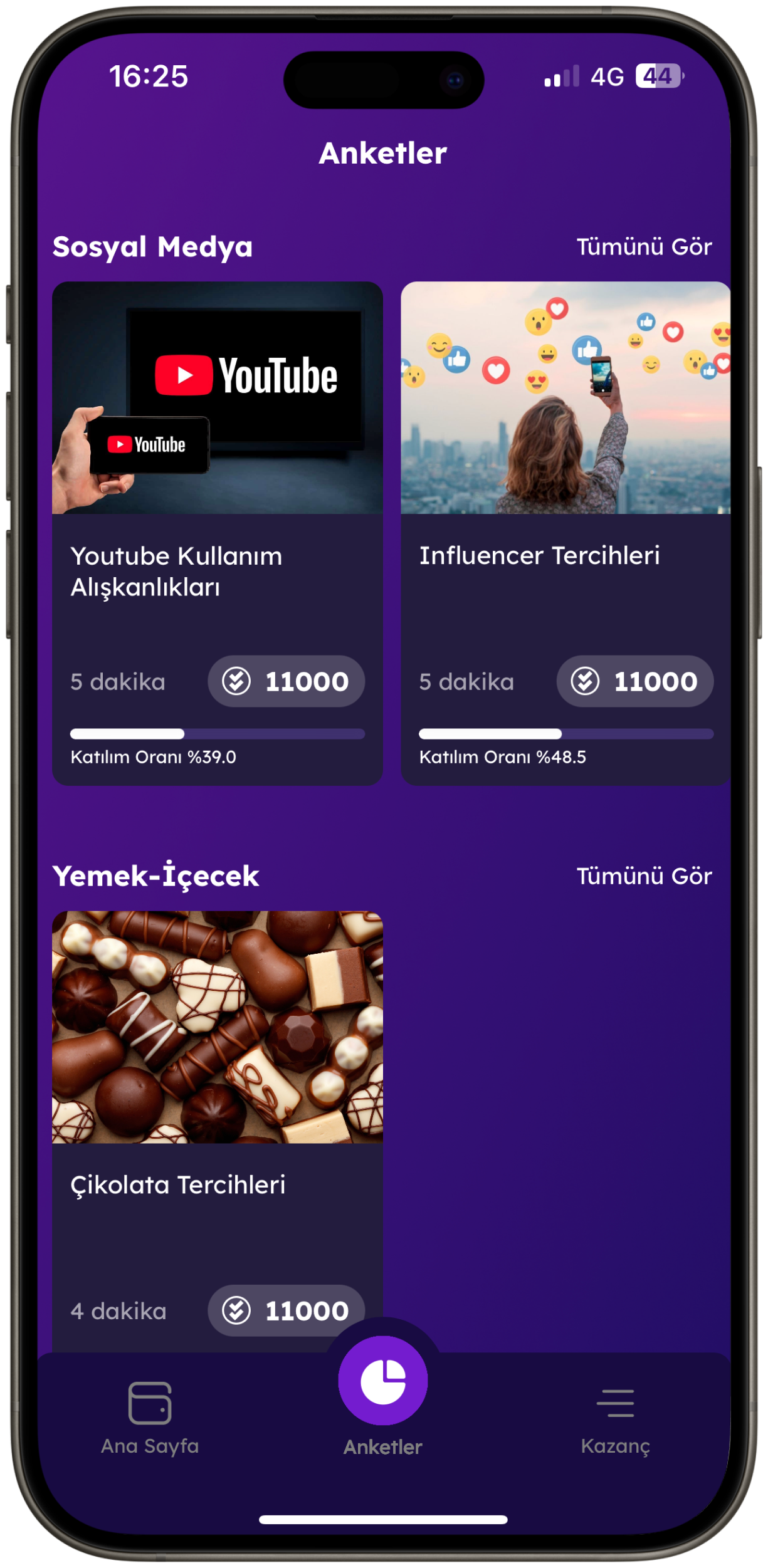 İlgi alanlarınıza, kişisel bilgilerinize ve uygulama profilinize göre sizin için seçilmiş anketlerden dilediğinizi yanıtlayın. Yanıtlamak istediğiniz anket kategorileri hakkında fikirlerinizi ve tercihlerinizi paylaşırken nakit ödülleri kazanın, gelir elde edin.